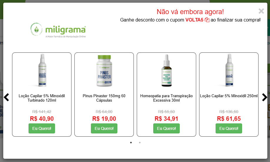 Para visitantes de primeira compra, prestes a sair do site, foi criada uma abordagem personalizada através de pop-ups com oferta de 5% de desconto no momento de saída, resgatando a atenção do cliente e aumentando as chances de conversão.